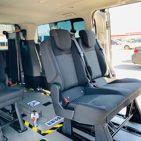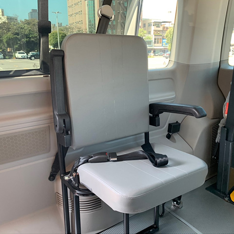 長青福祉的復康巴士採用硬漢派英國設計雙臂升降機,擁有防壓洩設計、高級鋼材防鏽蝕、高頻繁使用的好夥伴、可承載300公斤、降噪設計,開車不怕吵。並搭載德國設計輪椅固定系統,為國際IOS認證、承受拉力可達1頓、操作簡單方便快速、具防脫鉤安全設計。
